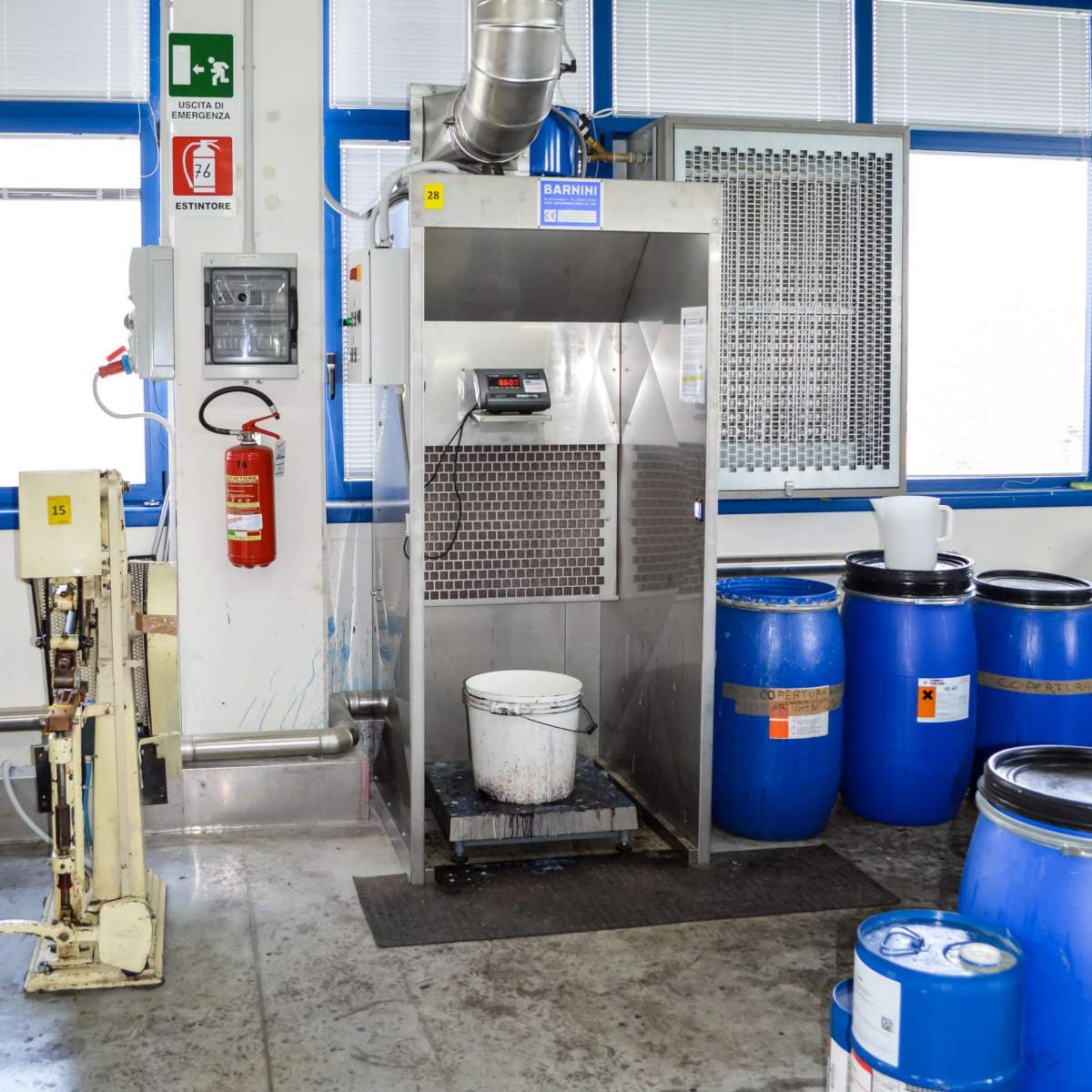 Questa cabina si differenzia dalla precedente esclusivamente per la presenza della tubazione di emissione in atmosfera la quale permette di convogliare all’esterno del fabbricato i vapori nocivi che si disperdono durante la fase di pesatura dei prodotti liquidi.