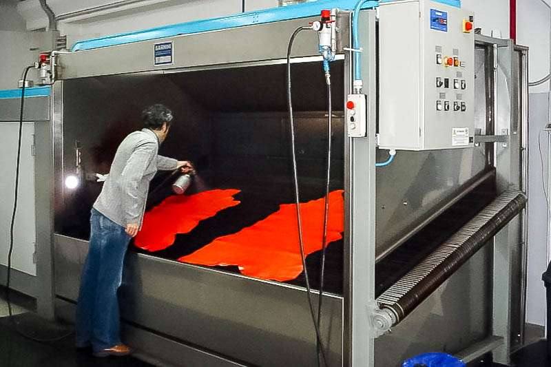 L’operatore inserisce le pelli da spruzzare e quando finisce di rifinire artigianalmente il pezzo tramite un pulsante muove e arresta il tappeto in direzione del tunnel di essiccazione. Soluzione interessante per ottenere ritmi produttivi più alti rispetto alla linea di spruzzatura manuale.