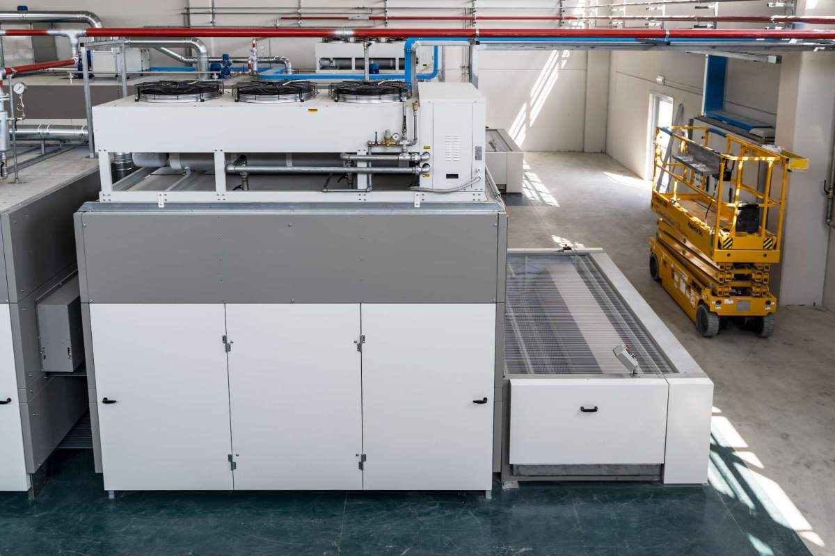 The air-water heat exchanger with a broad exchange surface area is constantly fed with cold water produced by a refrigeration group (Chiller) characterised by its high yield.